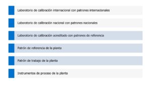 Esta trazabilidad se puede mostrar de la siguiente forma. En la siguiente imagen se representa la localización de los distintos niveles de trazabilidad. Desde el nivel más bajo «Instrumentos de proceso en planta», su trazabilidad depende de los niveles superiores.