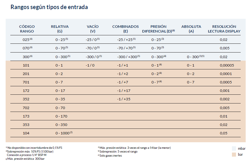 Tipos de presión disponibles: relativa, absoluta, vacío, combinados y diferencial